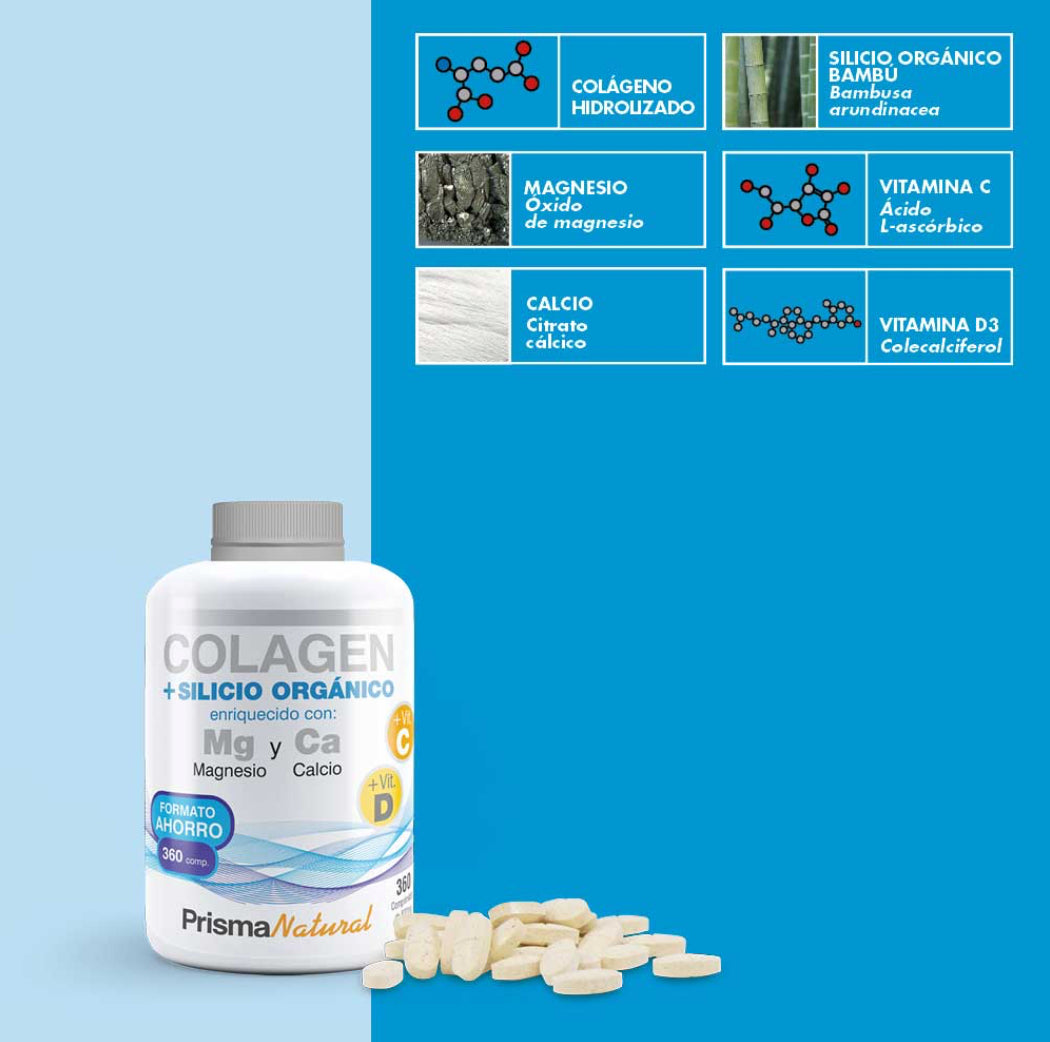 Gracias a su fórmula completa, los comprimidos Colagen + Silicio orgánico aportan una serie de beneficios como: el mantenimiento en buen estado y funcionalidad de los huesos y músculos, prevención del desgaste y deterioro asociados a la edad, promoción de la producción de colágeno en los huesos, piel y cartílagos, regulación de la función psicológica, disminución del cansancio y fatiga.