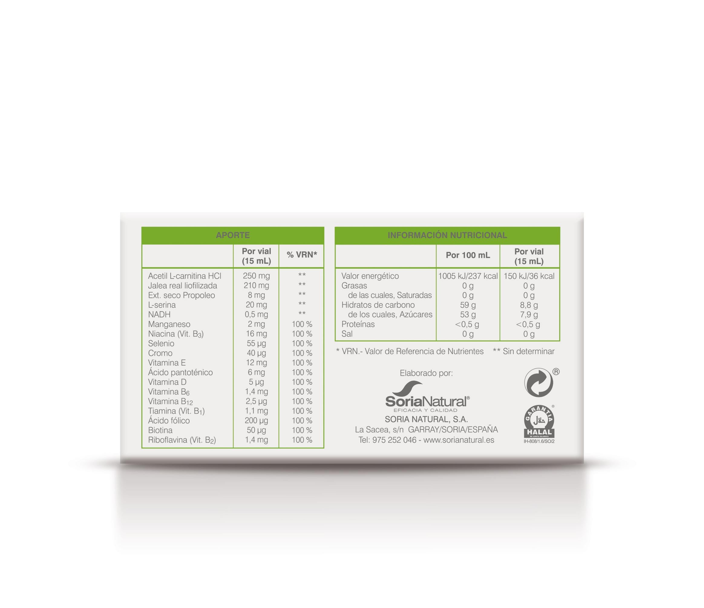 Vial: glucosa, fructosa, jalea real fresca (mínimo 2.100 mcg de ácido 10-hidroxidecenoico/vial), propóleo (mínimo 160 mcg de galangina/vial), miel; magnesio, potasio, fósforo, calcio, vitamina C, vitamina D3, vitamina B12, cromo; glicina, aroma natural de frutos del bosque, regulador de acidez: ácido cítrico, conservante (sorbato potásico) y agua glicerinada.