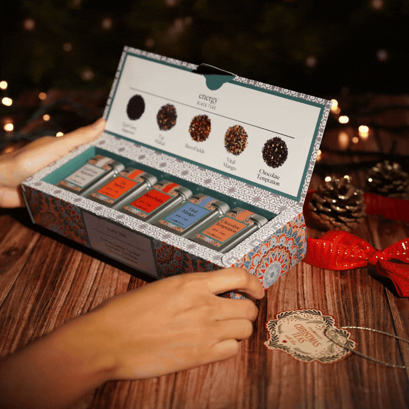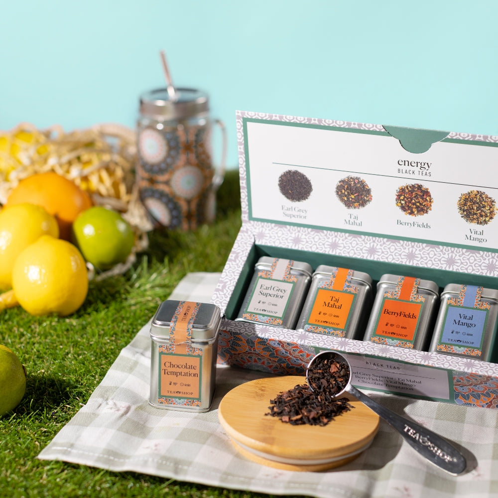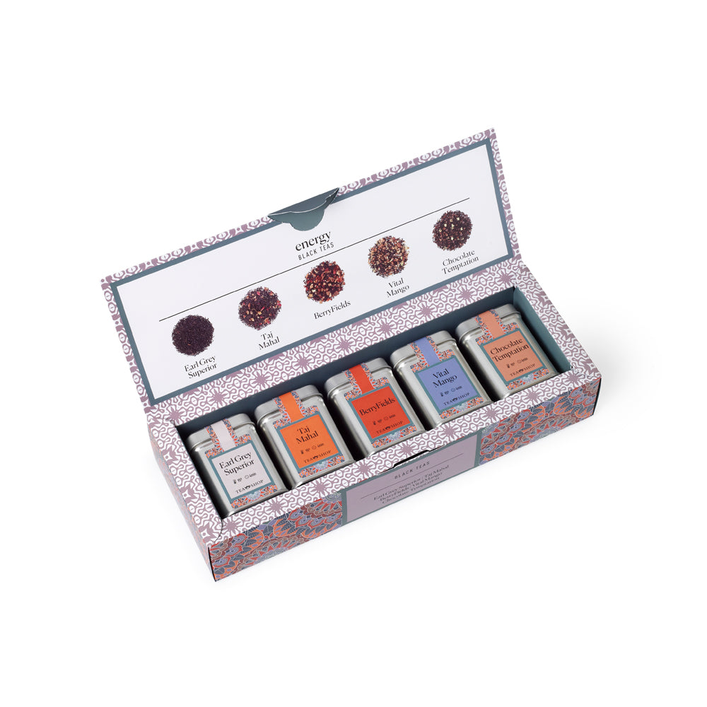 Energizante selección de tés con sabores intensos que aportan la vitalidad necesaria para empezar el día. El Té Negro Earl Grey Superior es un clásico e icónico té negro perfumado en Occidente con lima de bergamota. El Té Negro Taj Mahal contiene trozos de canela, piel de naranja, pétalos de rosa y aroma. De sabor exótico, carácter redondo y aroma profundo. El Té Negro BerryFields está combinado con una selecta y envolvente mezcla de frutos silvestres, manzana y remolacha que predominan sobre el característico sabor del té negro. Té Negro Vital Mango es ideal para aquellos que buscan un té dulce y fresco que les aporte energía y vitalidad. Finalmente, el Té Negro Chocolate Temptation es una fuente de minerales como el magnesio y el calcio, fibra y vitaminas A y C. La mezcla perfecta para empezar el día con la energía del té negro combinado con el chocolate negro y blanco.Almacenar en un lugar fresco y seco. Caja completamente reciclable.