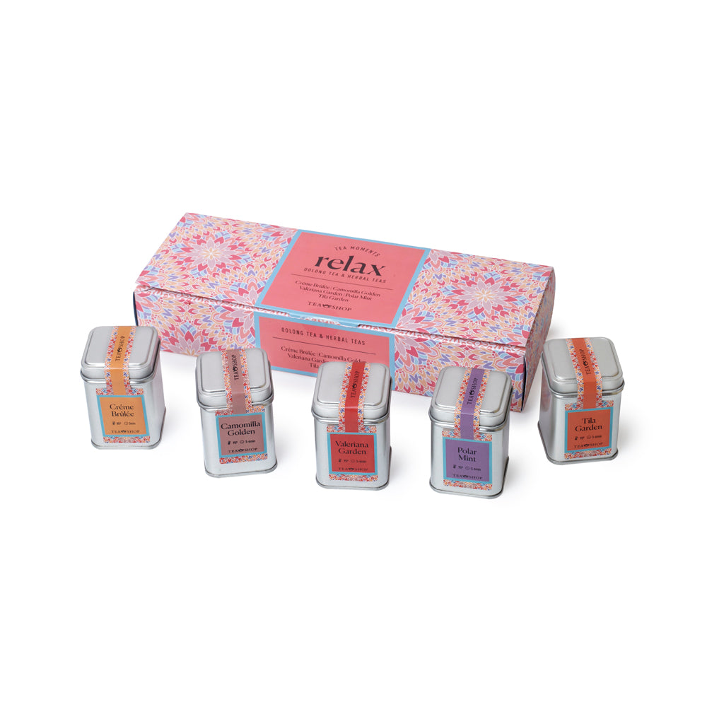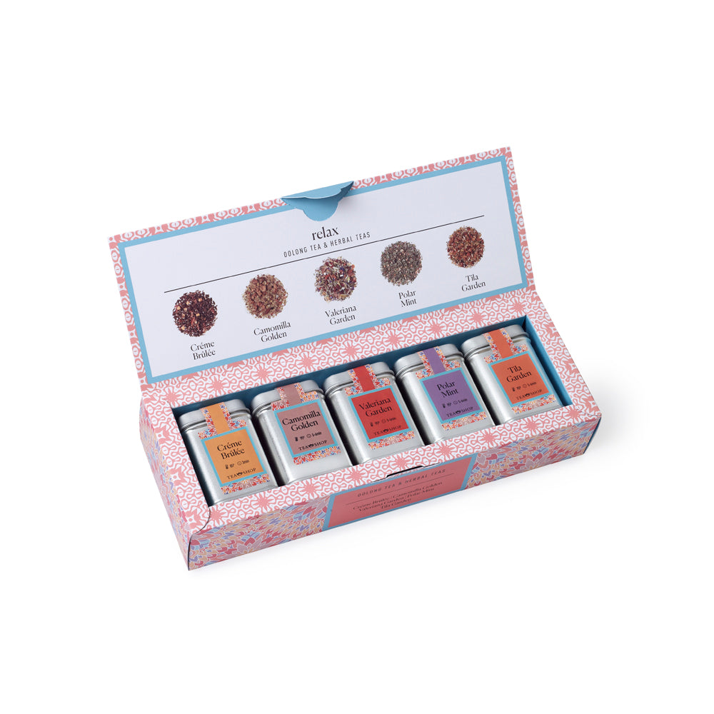 Exclusiva selección de tés e infusiones relajantes y digestivos para disfrutar de los momentos de relax. El Té Oolong Créme Brûlée es una cremosa y dulce mezcla de Té Oolong que sacia el paladar y recuerda al sabor de la alta pastelería; un té perfecto para los amantes de los sabores cremosos y que, además posee grandes funciones digestivas. La Infusión Camomilla Golden es una mezcla muy aromática con el aporte de las propiedades de la camomila y el delicioso sabor de la manzana asada. La Infusión Valeriana Garden contiene frutas, flores y plantas que ayudan a reducir el estrés. Una infusión ideal para relajar el cuerpo y la mente, de delicado aroma y envolvente sabor. La Infusión Polar Mint es una combinación de mentas (menta poleo orgánica, menta piperita y menta dulce) con semillas de escaramujo y un toque de regaliz. Por último la Infusión Tila Garden es una infusión relajante de carácter dulce y balsámico que favorece el ritmo biológico. Almacenar en un lugar fresco y seco. Caja completamente reciclable.