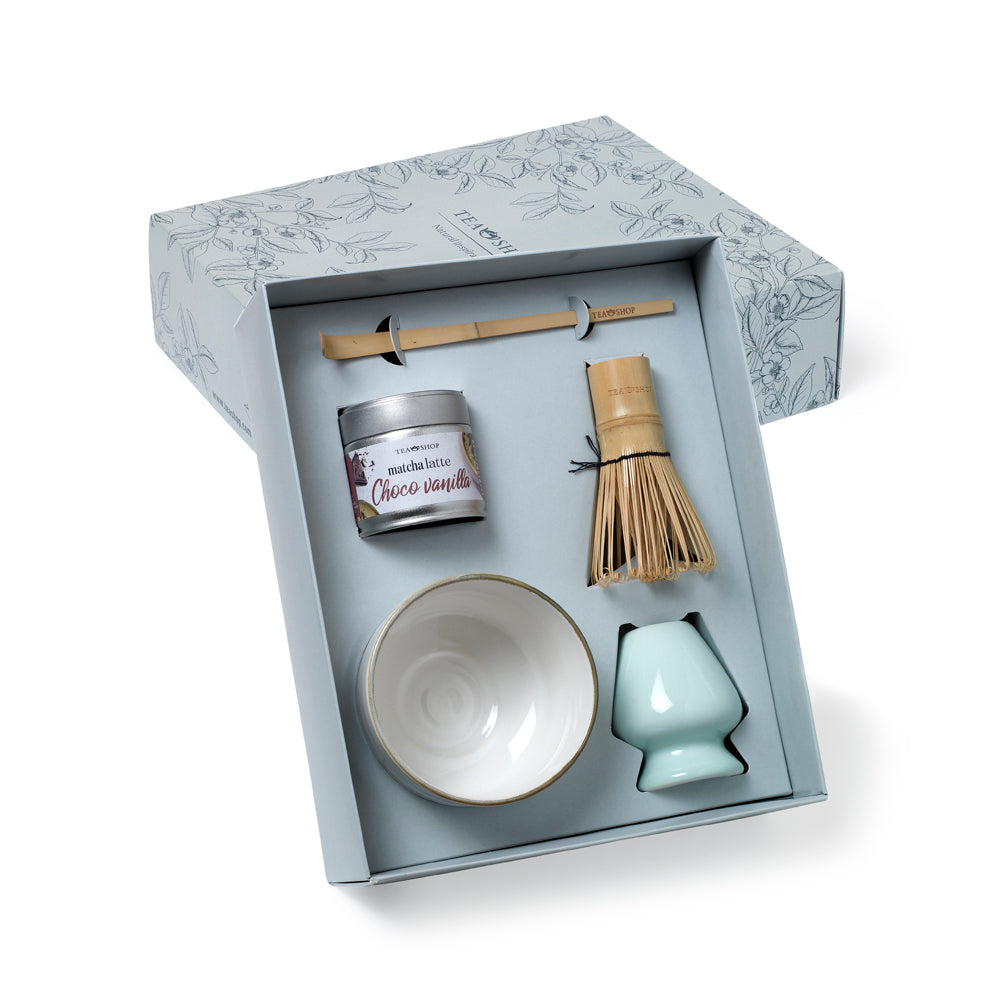 Tea Shop presenta un set de imprescindibles para la preparación del tradicional Té Matcha, siguiendo la ceremonia japonesa clásica. Incluye 1 lata de 30g de nuestro Matcha Latte Choco Vanilla con su intenso sabor a cacao y el toque floral de la vainilla, 1 Cucharita de Bambú para preparar la medida correcta, 1 Bowl Matcha para prepararlo, 1 Matcha Whisk para batir el polvo dentro del bol y 1 Matcha Whisk Holder de porcelana para conservar correctamente el Matcha Whisk.